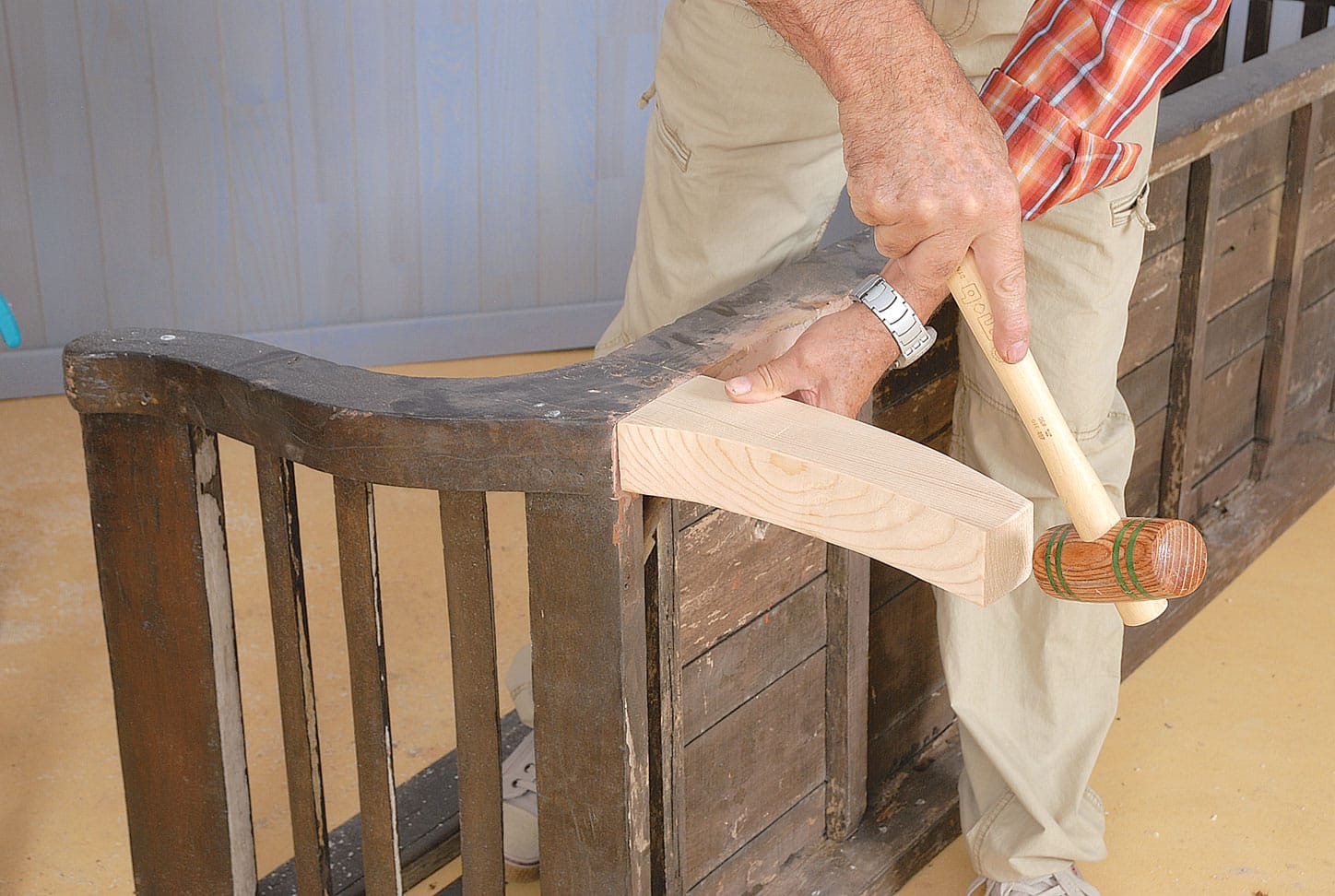 Mais si le collage ne permet pas de résoudre le problème, il faut alors démonter la chaise. Tenez-vous tranquille ! C’est aussi très simple. Munissez-vous d’un petit marteau en caoutchouc. N’utilisez pas l’acier, cela peut déformer les bois. Donnez ensuite de petits coups au niveau des joints pour détacher les pièces les unes des autres. Soyez très attentif. Vous devrez être en mesure de tout remettre à la bonne place lorsque vous aurez fini.